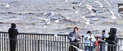 东疆海贝乐园的观海栈道上,游客迎着海风投喂鸥群。
