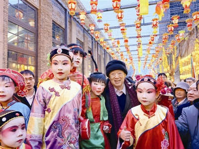 这时,“高跷闹春”活动同步开启,天津大学太雷路变身高跷PK的舞台,陈台子同乐高跷老会、咸水沽全乐高跷、葛沽长恒高跷、冯高庄同乐高跷老会、曹庄子同利文武高跷老会五大老会同台献艺,艺人们脚踩高跷,身姿矫健、动作娴熟,异彩纷呈的高跷巡游引得现场观众阵阵喝彩,在天津本土民间艺术的独特魅力中,沉浸式体验元宵民俗的热闹氛围。人群中,冯骥才拿出手机,记录下这一他最熟悉的天津民俗表演,并向在场演员抱拳致意。